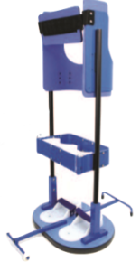 Description: Aluminum frame incorporating thermoplastic footplate, foam knee block, hip and knee locks, and chest and back panels. Three-point system keeps patient upright.
